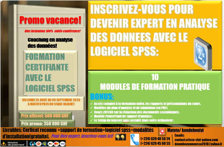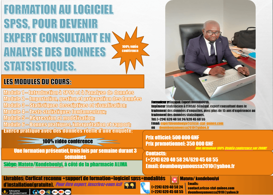 Les 10 modules de formation ci-dessous développés par expert DOUMBOUYA, qui va vous permettre d'analyser toutes sortes de données administratives ou d'enquêtes terrain.