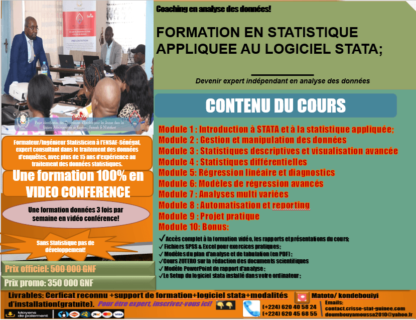 Les 10 modules de formation ci-dessous développés par expert DOUMBOUYA, qui va vous permettre d'analyser toutes sortes de données administratives ou d'enquêtes terrain.